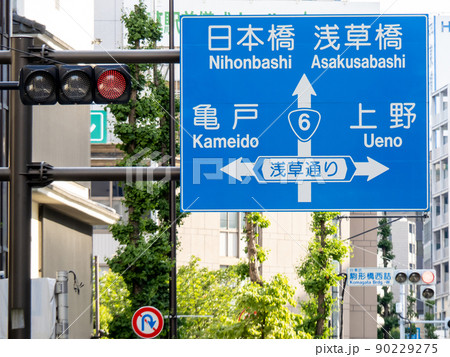 国道6号と浅草通りの交差点(駒形橋西詰)を案内する道路標識(案内標識)。東京都台東区内。