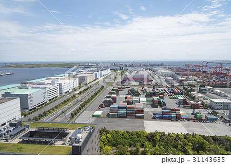 東京港に並ぶ倉庫・物流センターとコンテナ(東京都江東区)