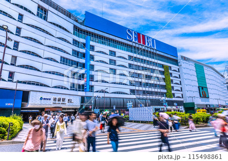 日本の東京都市景観 池袋駅東口。右奥に黄色いイケバスが見える