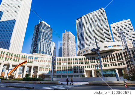 新宿高層ビル群を背景に見た、都庁舎と都議会議事堂を結ぶ連絡通路