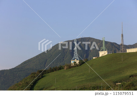 朝の別府湾サービスエリアから見る十文字原展望台と鶴見岳