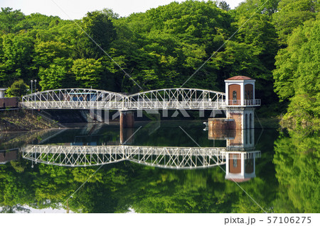 新緑の多摩湖橋から見る村山上貯水池取水塔