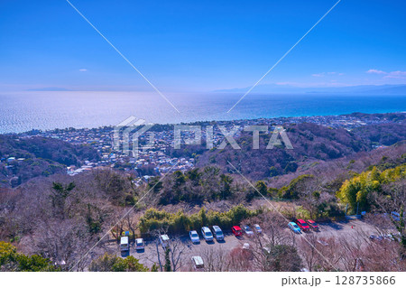 神奈川県平塚市の湘南平展望台から大磯町の街並み、伊豆半島、相模湾の風景