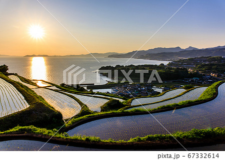 江ノ串の棚田(水張風景)の夕陽 【長崎県東彼杵郡】