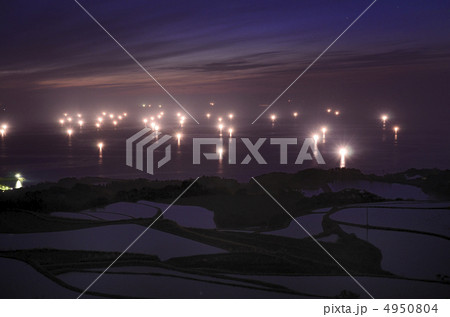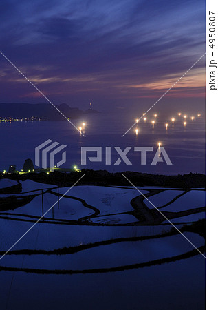 山口県 夏 長門市油谷地区 東後畑棚田と漁火