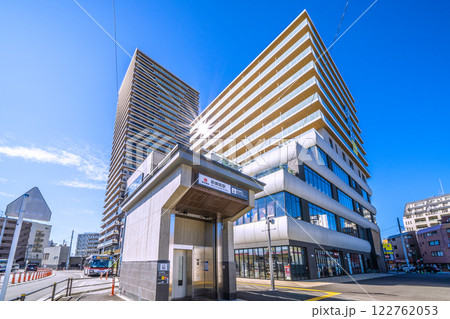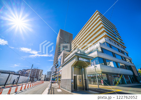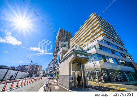 日本の横浜都市景観 東急新横浜線 新綱島駅エレベーターなどを望む。新時代に希望の光=9日