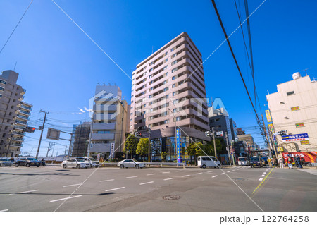 日本の横浜都市景観 綱島の交差点などを望む。画面右奥方向に進むと綱島駅へ=9日