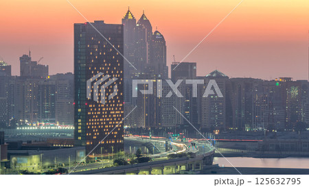 Buildings on Al Reem island in Abu Dhabi day to night timelapse from above.