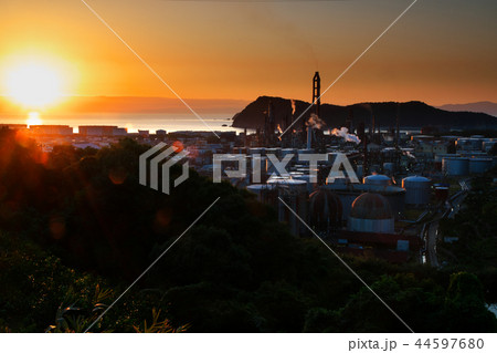 工場夕景と海 夕日に照らされた煙突 東燃 海南市和歌山県