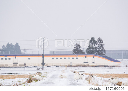 【山形線】雪原にいるハクチョウと新幹線つばさ号