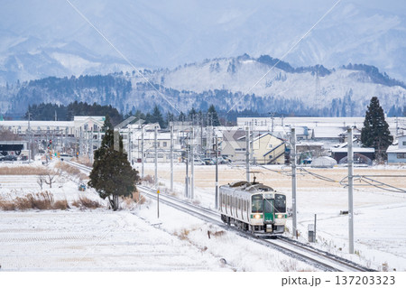 【山形線】冬の田園風景を走行する普通列車