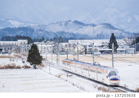 【山形線】冬の田園風景を走行する新幹線つばさ号