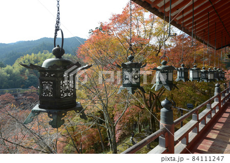 秋の談山神社 拝殿の釣り灯篭と紅葉 奈良県桜井市多武峰
