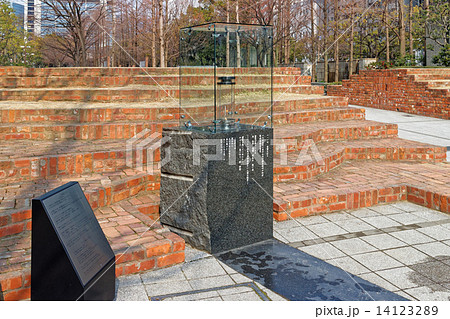 神戸市の東遊園地に設けられた「慰霊と復興のモニュメント」の一角と、神戸市役所1号館(高層ビル)