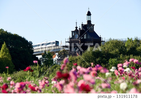 モリコロパークのコスモスとリニモ
