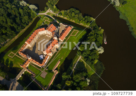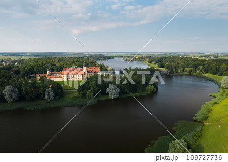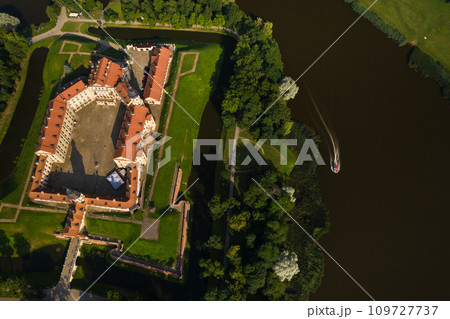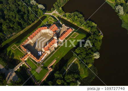 Top view of the Nesvizh Castle and the park in the summer.Belarus