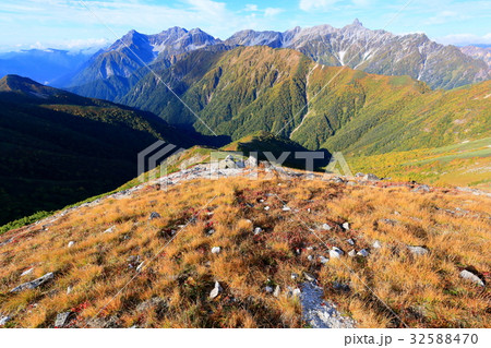 大天井岳付近の稜線の草紅葉と槍・穂高連峰