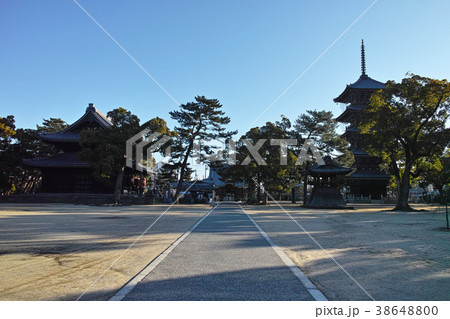 四国八十八ヶ所第75番札所「善通寺」東院(伽藍)境内(左から本堂、釈迦堂、鐘楼、五重塔)