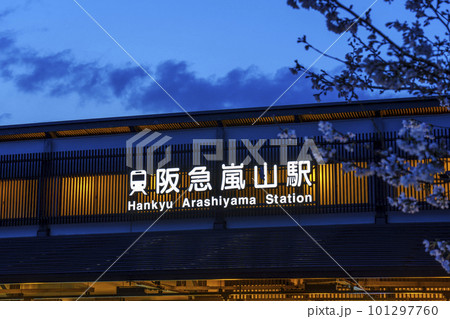 夜明け前の阪急嵐山駅外観 桜咲く季節