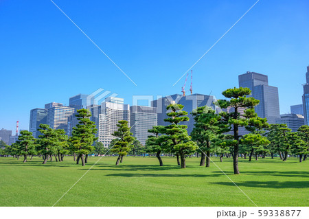 青空の観光地・皇居東御苑の松と芝生の広場・江戸時代のような清々しい空間(東京都千代田区)