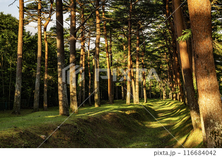 夕方の日が差し込む美しい赤松の松並木,