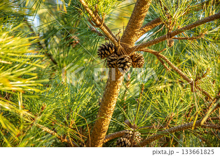 松の枝に実る松ぼっくりと柔らかな夕日が照らす自然風景