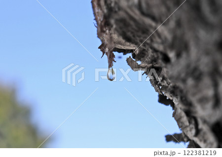 常緑高木のクロマツから分泌された透明の美しい松ヤニ