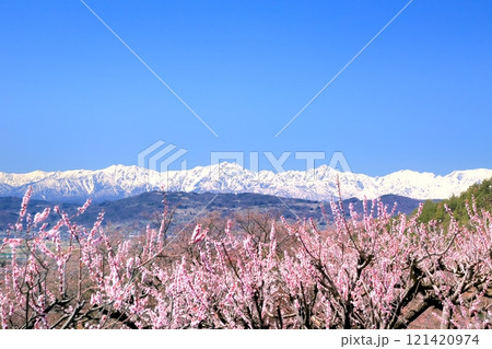 杏の花と北アルプス