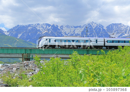 大糸線 初夏の白馬山麓を行く特急あずさ
