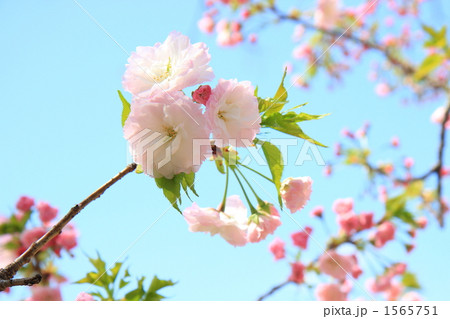 松月 ショウゲツ 八重咲の桜 ピンク色 青空背景 クローズアップ