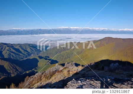 長野県大町市・鷹狩山より望む松本盆地と北アルプス
