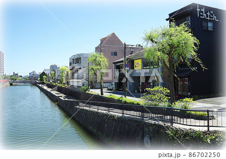 【絵画風】堀川(京橋川)沿いの街並み風景 … 島根県 松江市(快晴)
