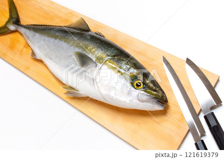 まな板の上に置かれた新鮮なブリと和包丁