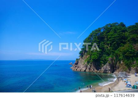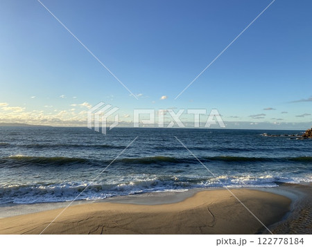 快晴の青空と青い海と砂浜に打ち寄せる白波と水平線に浮かぶ島