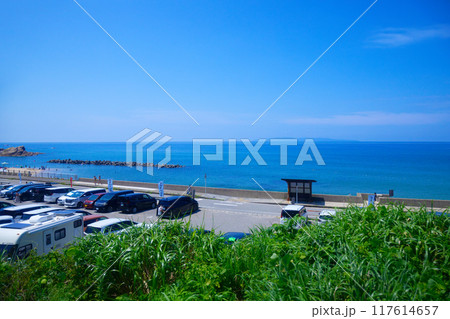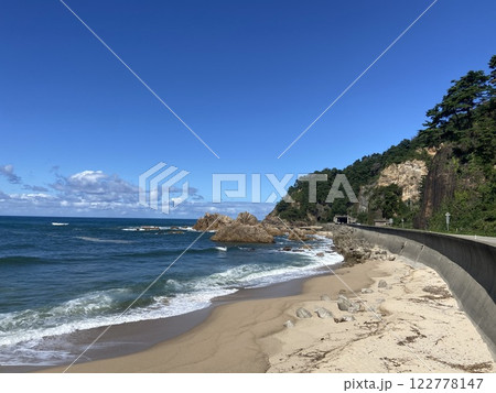 村上市板貝海岸の青空と青い海の笹川流れ