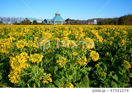 尖がり屋根と菜の花畑 道の駅とみうら枇杷倶楽部