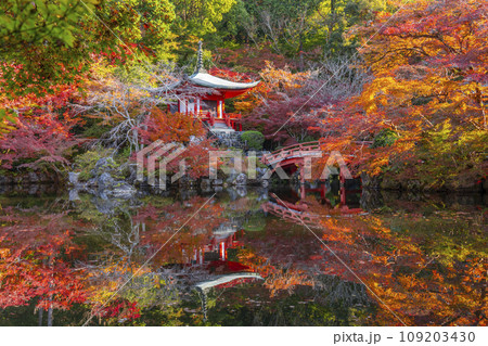 秋の京都 醍醐寺 紅葉に包まれた弁天堂のリフレクション(林泉)