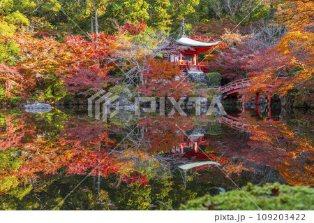 秋の京都 醍醐寺 紅葉に包まれた弁天堂のリフレクション(林泉)