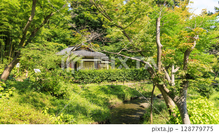 日本庭園に建つ古い茶室 (林洞庵、三渓園、横浜、神奈川県)