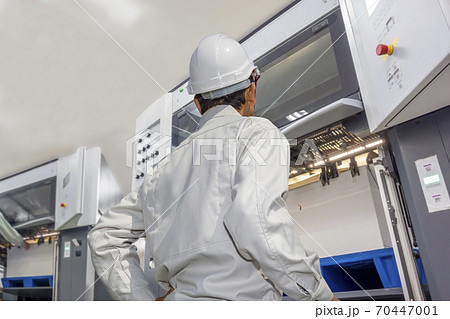 印刷工場で枚葉オフセット印刷機を操作する作業着を着た男性オペレーターの後ろ姿の上半身。