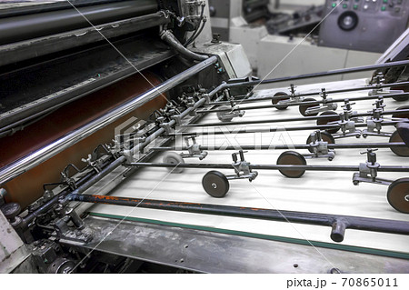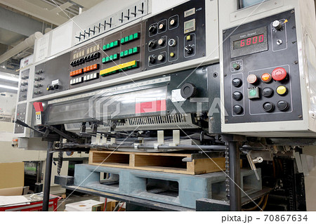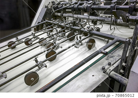 旧型オフセット枚葉印刷機の給紙部のクローズアップ