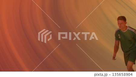 Jogging athlete wearing green sports uniform and shoes in studio with orange backdrop, copy space