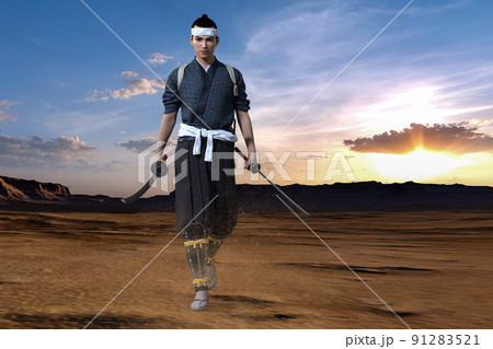 荒野で朝日が昇る明け方まで修行する両手に日本刀を持った武士