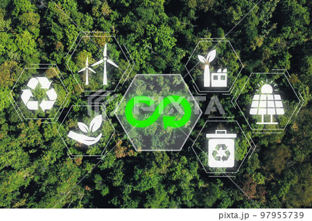 Circular economy concept, Aerial top view green forest with circular economy icon on vr screen, renovating and recycling existing materials and products as much possible.
