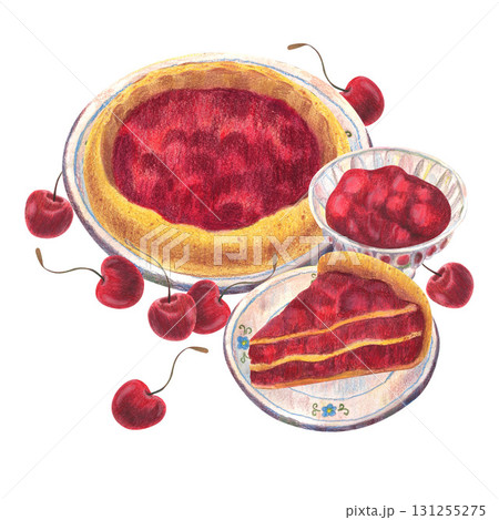 Homemade pie with red berries, jam in jar, piece of cake on plate and ripe cherries. Watercolor isolated illustration For tea party, vintage kitchen table setting, menu design banners and clip art.