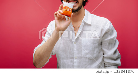 Enjoying a tasty snack in front of a vibrant pink background