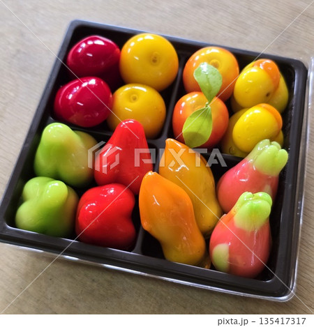 Luk chup, Colourful fruit and vegetable shaped beautiful Thai sweet mung bean coconut milk desert, Thai desert.