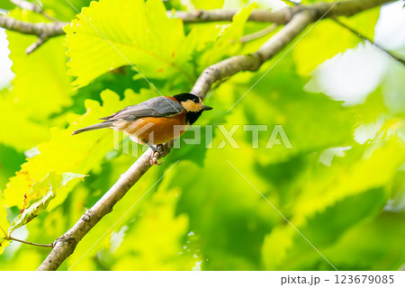 初夏の森で枝にとまるヤマガラ幼鳥