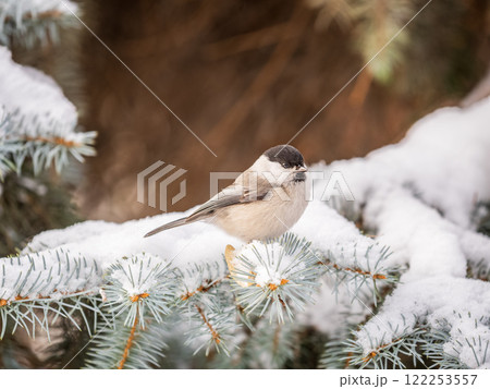 Cute bird the willow tit, song bird sitting on the fir branch with snow in winter