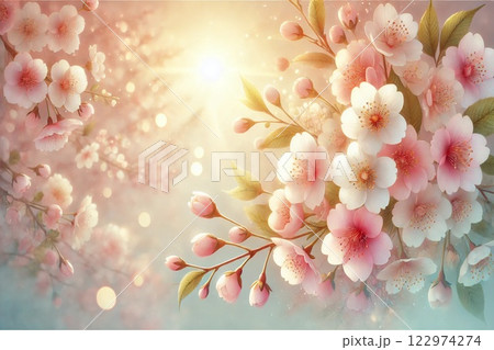 淡いキラキラピンク色ぼかし背景に花びらが舞い散る美しい桜の花のフレーム 3DCGイラスト